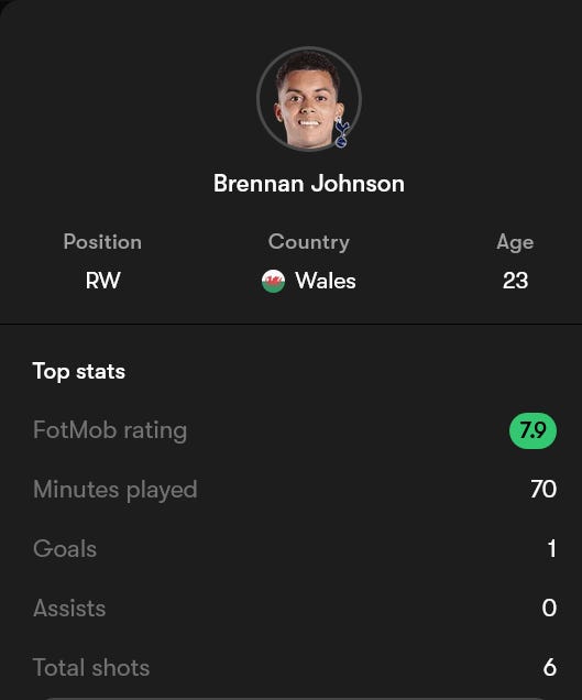 I highlighted last newsletter how much I am enjoying the Kulusevski midfield revolution, and I can’t stress enough how much that still stands. For some reason, he’s just seemed to find a home for us centrally. His intensity, ball carrying and creative passing has unlocked a new level for us as a team. I’d like to see him get some goal contributions to compliment his all around game going forward.